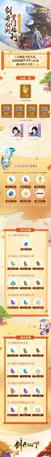 游戏为大家准备了海量的福利,,,包括上线即可获得的全渠道预约礼包、、十连抽等福利,,,输入密令“JK666”、、、、“JK888”即可领取紫色弟子,,,达到金丹期后还有功法宝箱可领,,,,助力全宗上下实力提升……所有奖励总价值超过648元,,,而邀请好友一起体验,,,,更可以获得额外的奖励哦~